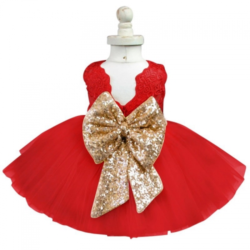 Đầm vải tuyn phối ren thời trang mùa hè cho bé gái, với một chiếc nơ lớn đính kim tuyến ở phía sau, thiết kế vải tuyn nhiều lớp phối dây.